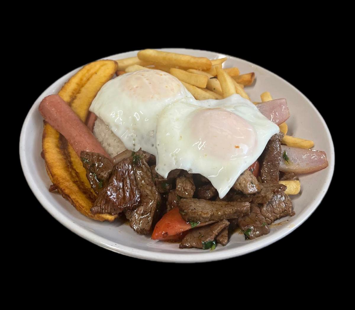 Beef tenderloin, Rice, French Fries, Fried Platains, Fried egg, salad,