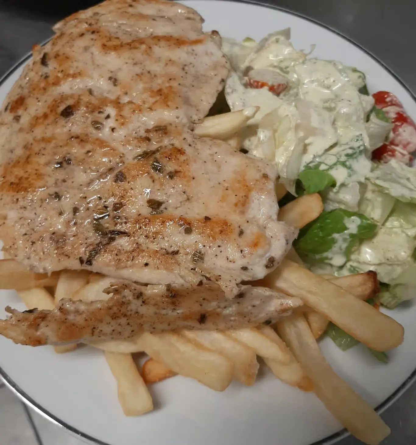 This dish is accompanied by crispy fries and a fresh lettuce and tomato salad, served with a touch of creamy dressing, creating a perfect balance between healthy and tasty.